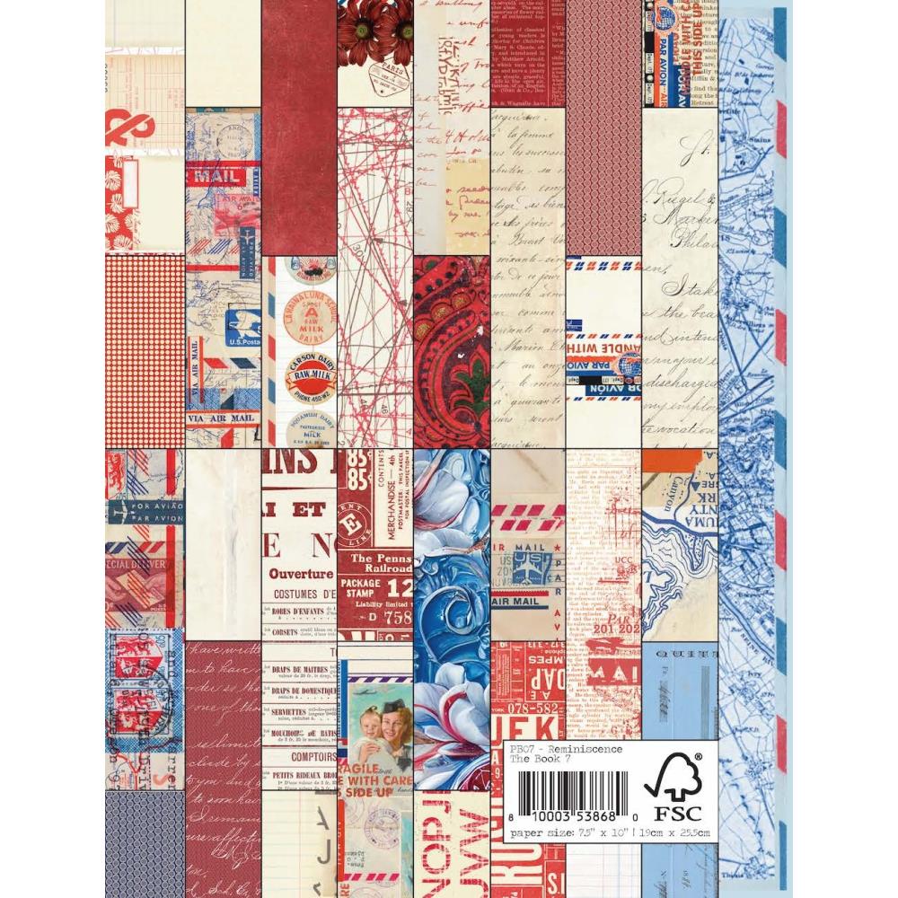 The Reminiscence Book 7 7.5" x 10" patterned cardstock book includes 32 double-sided sheets of 120gsm cardstock and 32 double-sided sheets of 250 gsm cardstock.